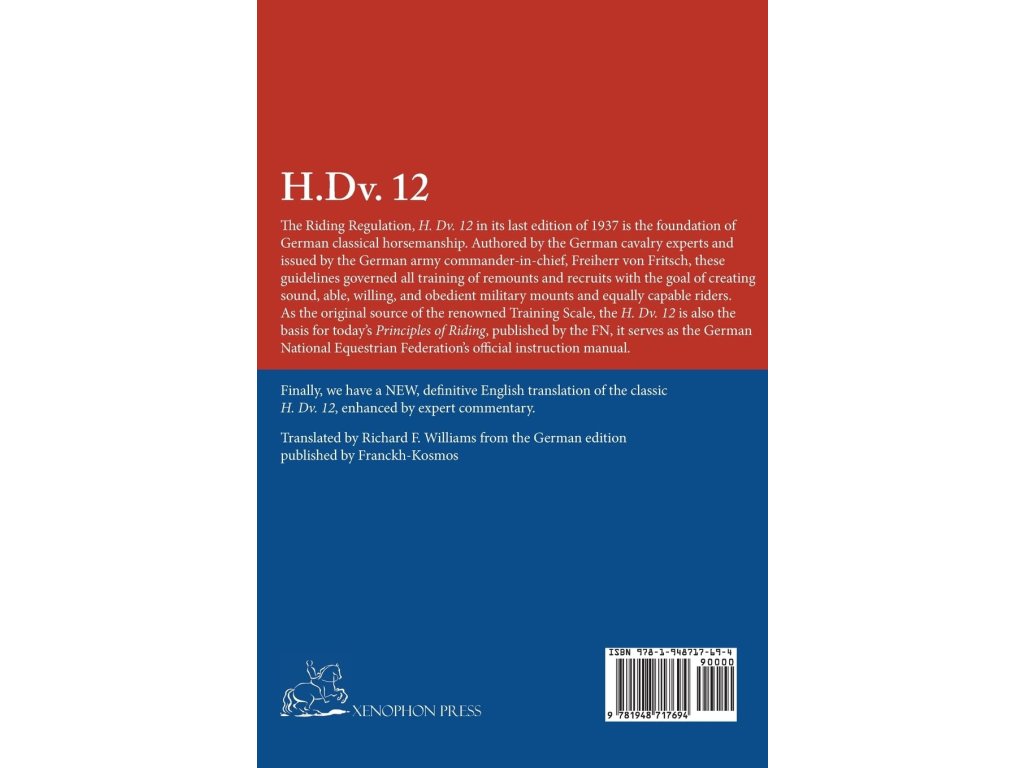 The Riding Regulation, H. Dv. 12 in its last edition of 1937 is the foundation of German classical horsemanship. Authored by the German cavalry experts and issued by the German army commander-in-chief, Freiherr von Fritsch, these guidelines governed all training of remounts and recruits with the goal of creating sound, able, willing, and obedient military mounts and equally capable riders. As the original source of the renowned Training Scale, the H. Dv. 12 is the basis for today's Principles of Riding, published by the FN, it serves as the German National Equestrian Federation's official instruction manual.